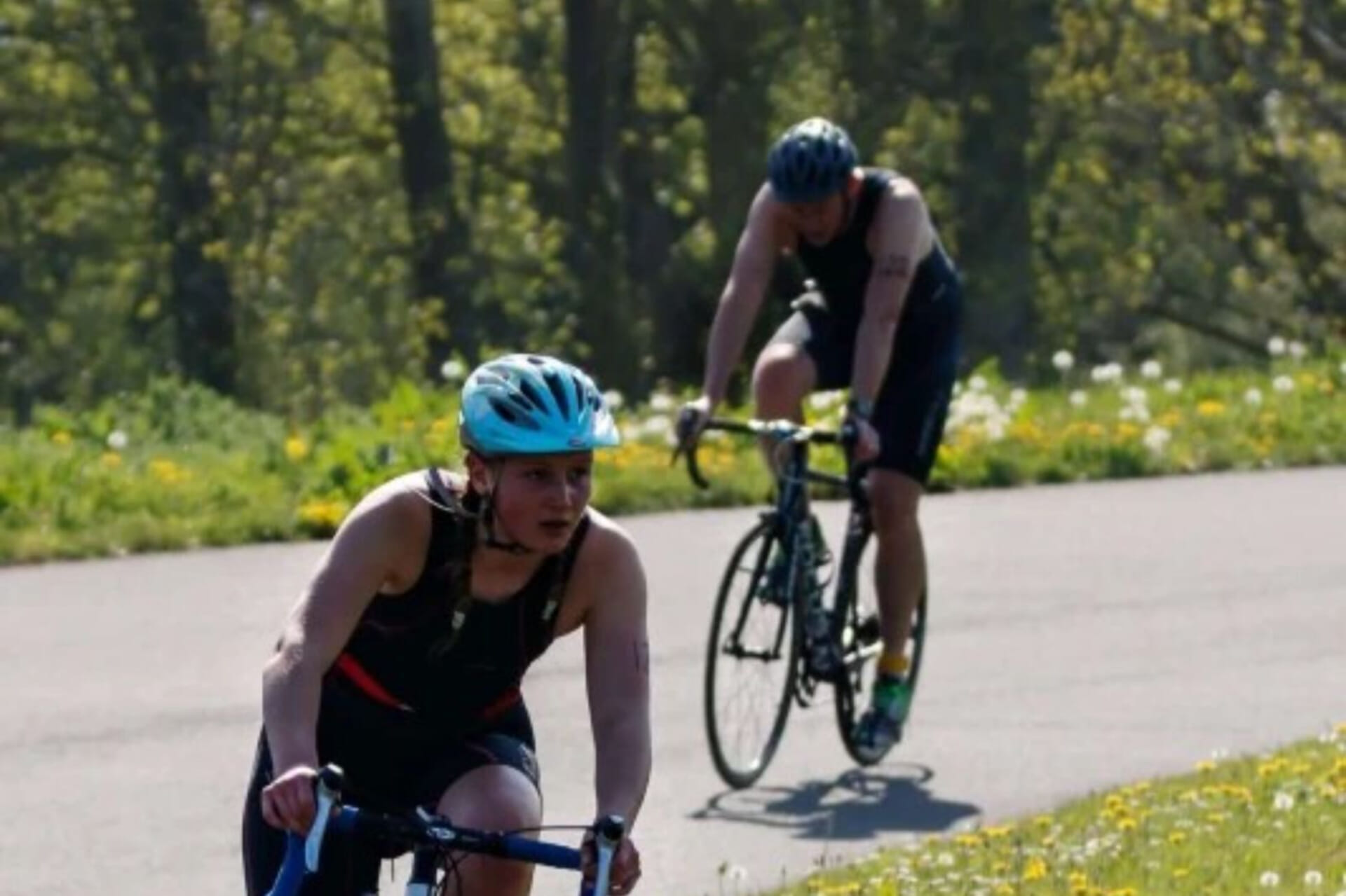 Each team member takes on one or two disciplines — swim, bike or run.